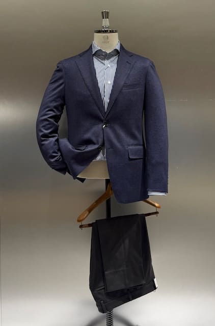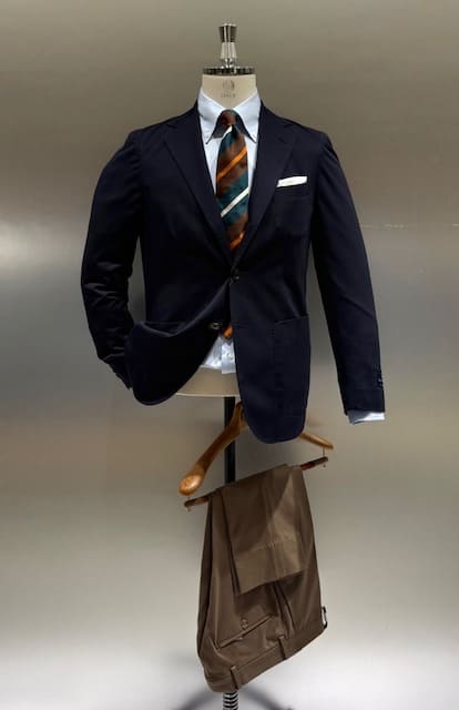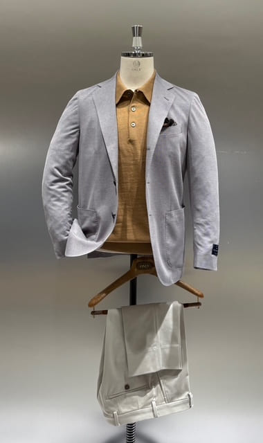 コットン素材なのでカチッとジャケパンスタイルでも雰囲気が変わります。