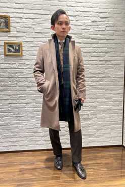 - 飾り過ぎない同系色のソリッドタイをシンプルに合わす事で、気品と品格を高めたコーディネート