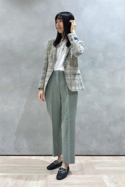 合わせたパンツはコットン調ながらこちらもジャージーで、涼し気なオックスフォード調の高機能パンツ、絶妙な色合いがジャケットに好相性。
