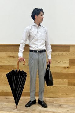 中のシャツはオックスフォード生地で仕立てたONLYのオリジナルオーダーシャツ。