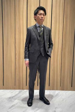 ブルーのスリーピーススーツに、ピンクのストライプネクタイを合わせた爽やかで穏やかな配色。