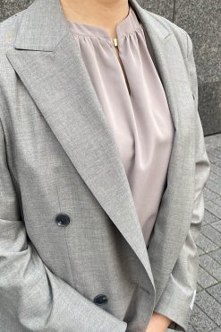 淡いピンクのバンドカラーシャツが柔らかく上品な印象となります。