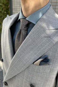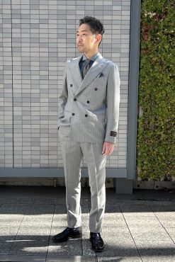 ウールリネン素材で夏らしく、涼やかな着心地を味わえるシアサッカー生地のダブルブレストスーツ。