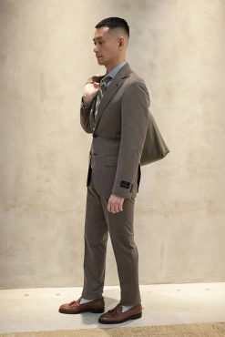 リネン素材のスーツに通気性の高いからみ織りのシャツを合わせたコーディネートはこれからの季節にオススメです。