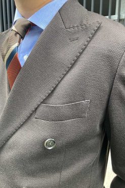 トレンドカラーであるブラウンの、上品な光沢感が魅力のスーツをセレクトしました。