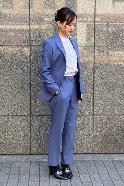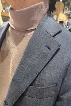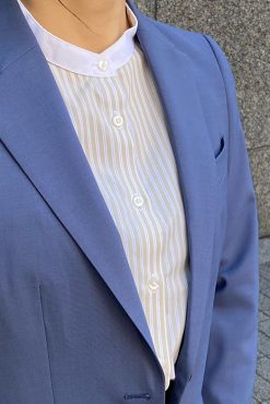 上品な光沢感が特徴の伊・カノニコ社のブルーのスーツ。