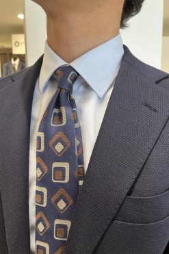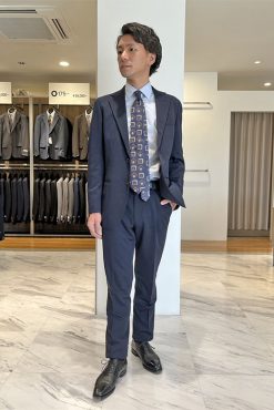 千鳥柄の生地はクラシックな印象を醸し出すので、ジャケットはダブルブレスト、パンツはツータックで仕立てました。ブロードホワイトシャツにネイビー小紋タイを合わせた、王道のクラシックスタイルでコーディネートしています。