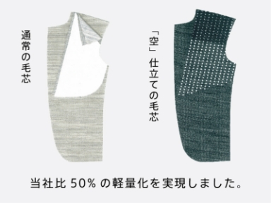 薄くて軽い1枚の特殊毛芯に樹脂を噴霧した独自の芯地を開発。軽く、保形性が十分にあり、かつソフトな着心地を実現しました。驚きの軽さをぜひご体感ください。