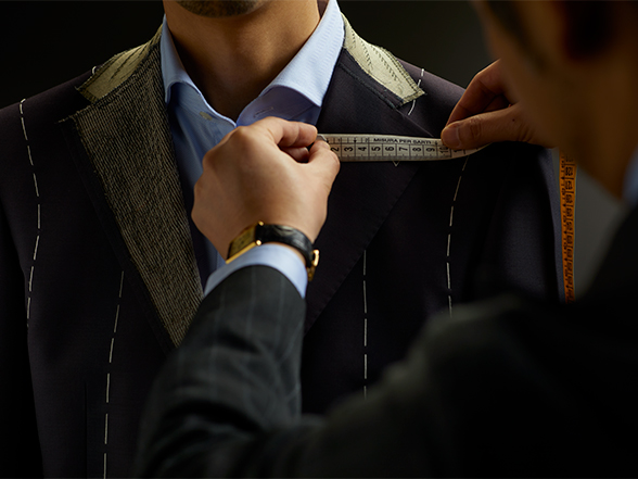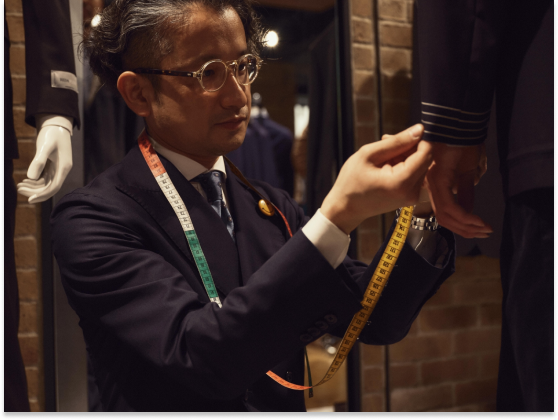 長年の経験から生み出された独自のゲージ服による採寸方法。的確で素早いフィッティング、且つスーツの美しいバランスを崩すことなく、高いフィット感と着心地の良さを実現します。