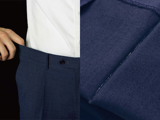 大切なスーツを長くきれいにご着用いただけますよう、ウール素材のパンツには全てシロセット加工と呼ばれる、型崩れを防ぐ特殊加工を無料で施しております。