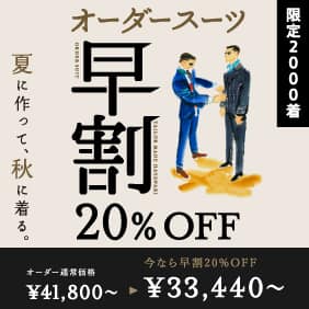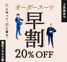 【限定2000着!!】新作秋冬生地をテーラーメイド「早割」でお仕立ていただくと20%OFFでご利用いただけます。