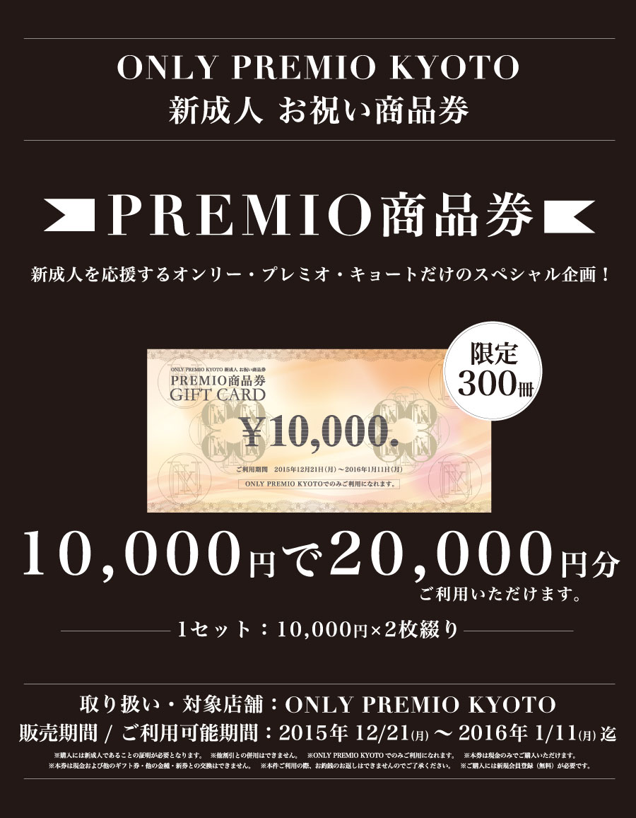 2015.12.22 火2015年12月21日(月)より、ONLY PREMIO KYOTOにて「新成人 お祝い商品券」を販売いたします。
