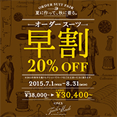 工場の閑散期に次シーズンのオーダースーツのご注文をお受けする事で工場稼働の無駄をなくし、かつリーズナブルに提供できる販売方法です。納期を最大2ヶ月頂戴し、20%OFFの価格でご注文いただけます。詳しくはこちら