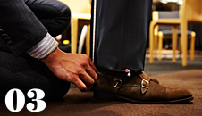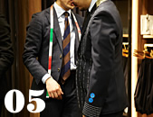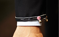 [ A ] シャツが1~1.5㎝見える長さに袖丈を指定。留めピンには鈴が付けられ、安全性を高めている