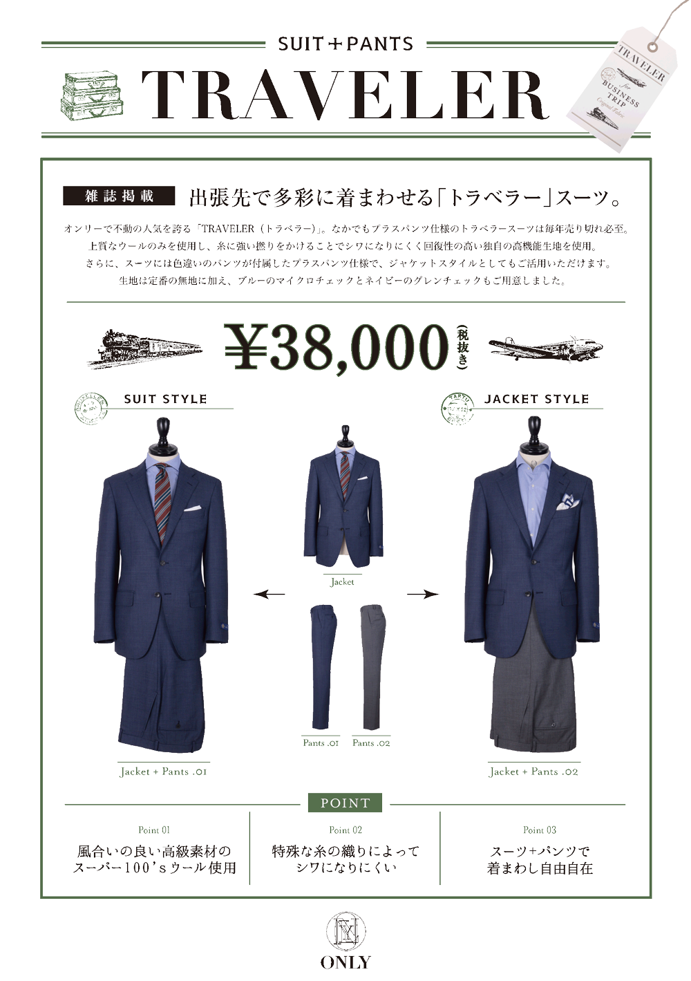 ジャケパンビズも楽しめる「トラベラー」は 出張が多いビジネスマンの“相棒”スーツです。