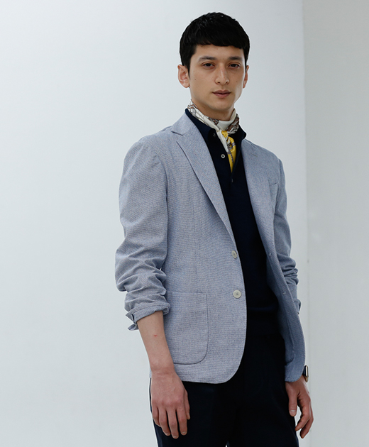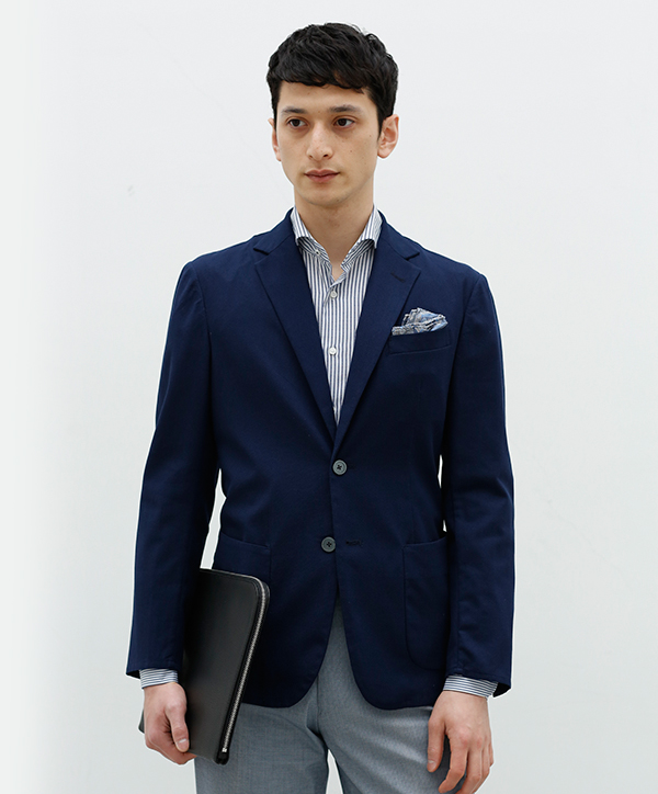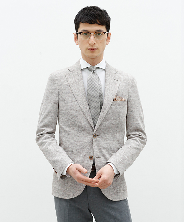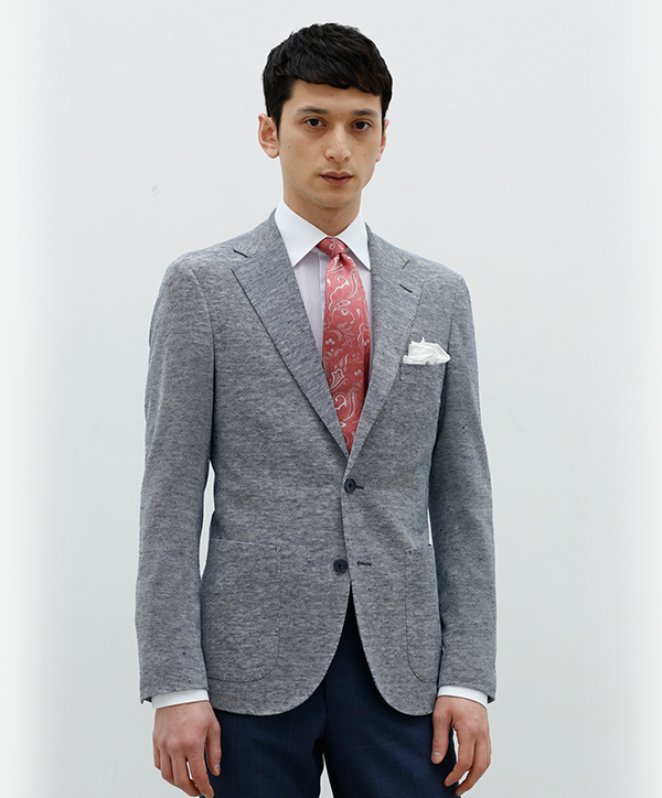 きっちりとしたタイドアップは男のビジネススタイルの基本。その際、あえてスーツではなくインポート生地のリネン混ジャケットを纏えば、装いに涼やかさと大人の余裕が漂います。