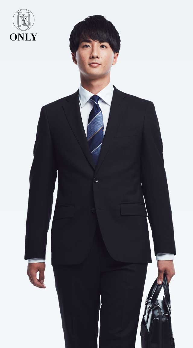 「最強」の名に相応しいオンリーのリクルートスーツは業種問わず使えるブラックがオススメ。ストレッチ性に優れ、自宅でも洗える機能性も備えます。